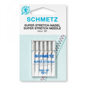 Супер стретч игла имеет специальный плоский стержень, что позволяет игле находиться ближе к челноку. Кроме этого, специальная конструкция иглы с выемкой облегчает вытягивание петли и ее захват челноком. Данная особенность предотвращает пропуск стежков даже на очень эластичных материалов.