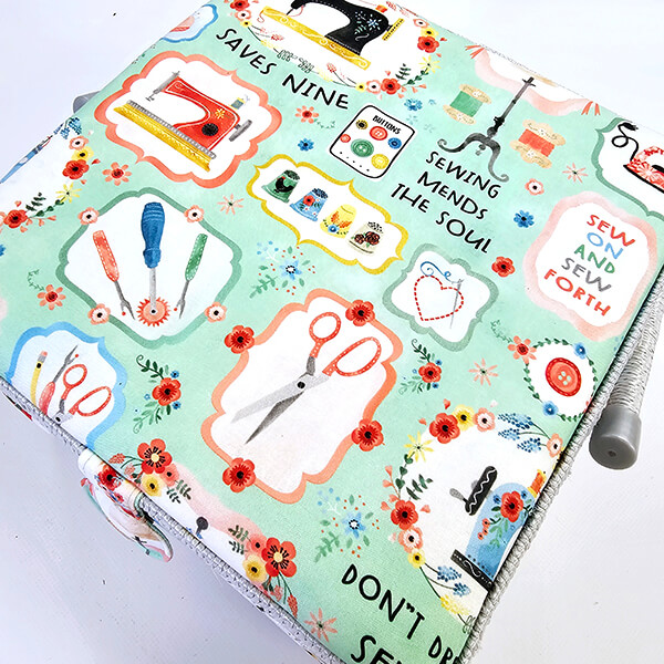 Шкатулка обтянута тканью из 100% хлопка, имеет плетеную ручку для переноски и оплетку по периметру крышки. Внутри шкатулки на крышке закреплена подушечка для хранения игл, а также имеется внутренний контейнер из пластика с отделениями для хранения мелких аксессуаров.