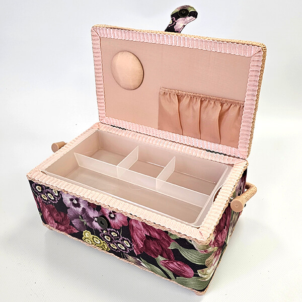 Шкатулка обтянута тканью из 100% хлопка, имеет плетеную ручку для переноски и оплетку по периметру крышки. Внутри шкатулки на крышке закреплена подушечка для хранения игл, а также имеется внутренний контейнер из пластика с отделениями для хранения мелких аксессуаров.