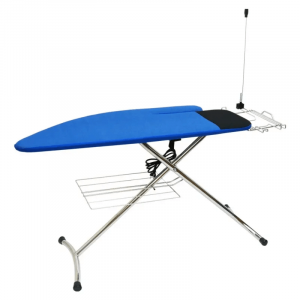Доска выполнена из оцинкованного металла с эпоксидной эмалью. Гладильная поверхность в виде решётки хорошо подходит для длительной обработки изделий, поскольку пропускает пар и помогает избежать влажных пятен на материале. В конструкции доски предусмотрена дополнительная рукавная консоль для комфортного глажения штанин, рукавов и т.д. Трехслойный чехол, состоящий из войлочной подкладки, поролона и покрытия фиксируется шнурками, обеспечивает отличное скольжение утюга и прилегание материала.