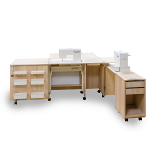 Имея подвижные опоры, стол легко перемещается в любое удобное место комнаты. Специальные стопоры позволяют сделать его неподвижным при эксплуатации. Стол имеет 2 выдвижных ящика для хранения различной швейной фурнитуры.