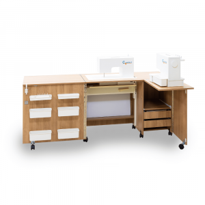 Швейный стол Комфорт-5 – компактный и в то же время функциональный стол, оснащенный 3-уровневым пневмолифтом для швейной машины, позволяет организовать рабочее место и содержать в порядке все швейные принадлежности. В столе предусмотрено место для хранения и использования как швейной машины, так и оверлока. На открывающейся дверце имеются лотки для швейных принадлежностей.