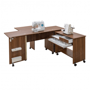 Для хранения различной швейной фурнитуры в столе предусмотрены 2 выдвижных ящика и навесные ящики из пластика. В последней модификации в тумбу стола добавлена дополнительная подставка для катушек и 2 секционных контейнера.