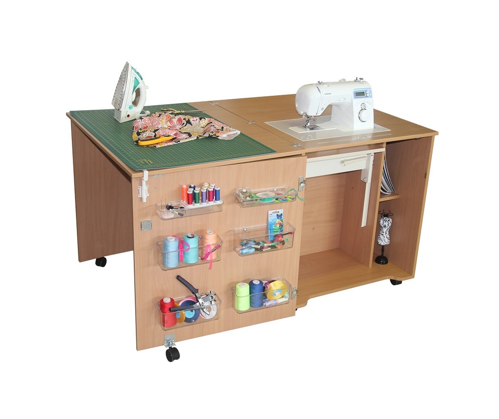 С одной стороны стола установлен механизм подъема швейной машины. Механизм может быть установлен как для машин стандартного размера, так и с увеличенными габаритами и весом. При этом габариты стола не меняются. На вертикальной откидной двери имеются прозрачные пластиковые контейнеры и игольницы. С противоположной стороны размещается оверлок и 6 ящиков для различных принадлежностей и фурнитуры. Также имеются две полочки.