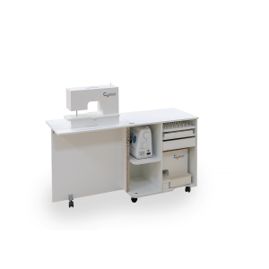 Конструкция стола предусматривает хранение и использование швейной машины и оверлока. Так же он оборудован выдвижной катушечницей на 56 катушек, секционным ящиком для удобного хранения небольших принадлежностей (иглы, пуговицы) и выдвижным ящиком.