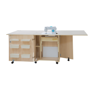 С одной стороны стола установлен механизм подъема швейной машины. Механизм может быть установлен как для машин стандартного размера, так и с увеличенными габаритами и весом. При этом габариты стола не меняются. На вертикальной откидной двери имеются прозрачные пластиковые контейнеры и игольницы.