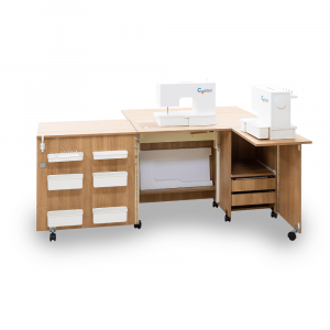 Стол имеет место для хранения оверлока и дополнительную поверхность для работы с ним. Имеются два выдвижных ящика* для хранения швейных принадлежностей.