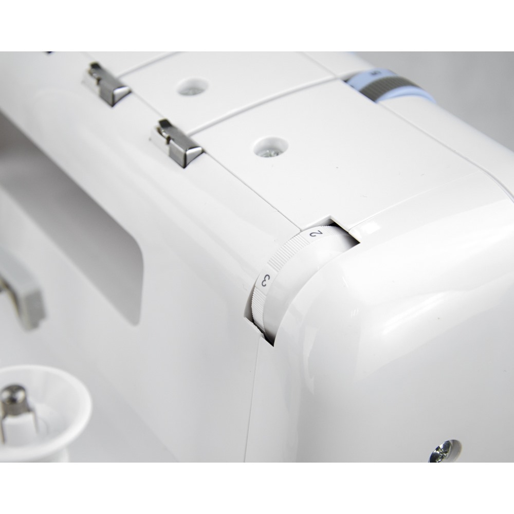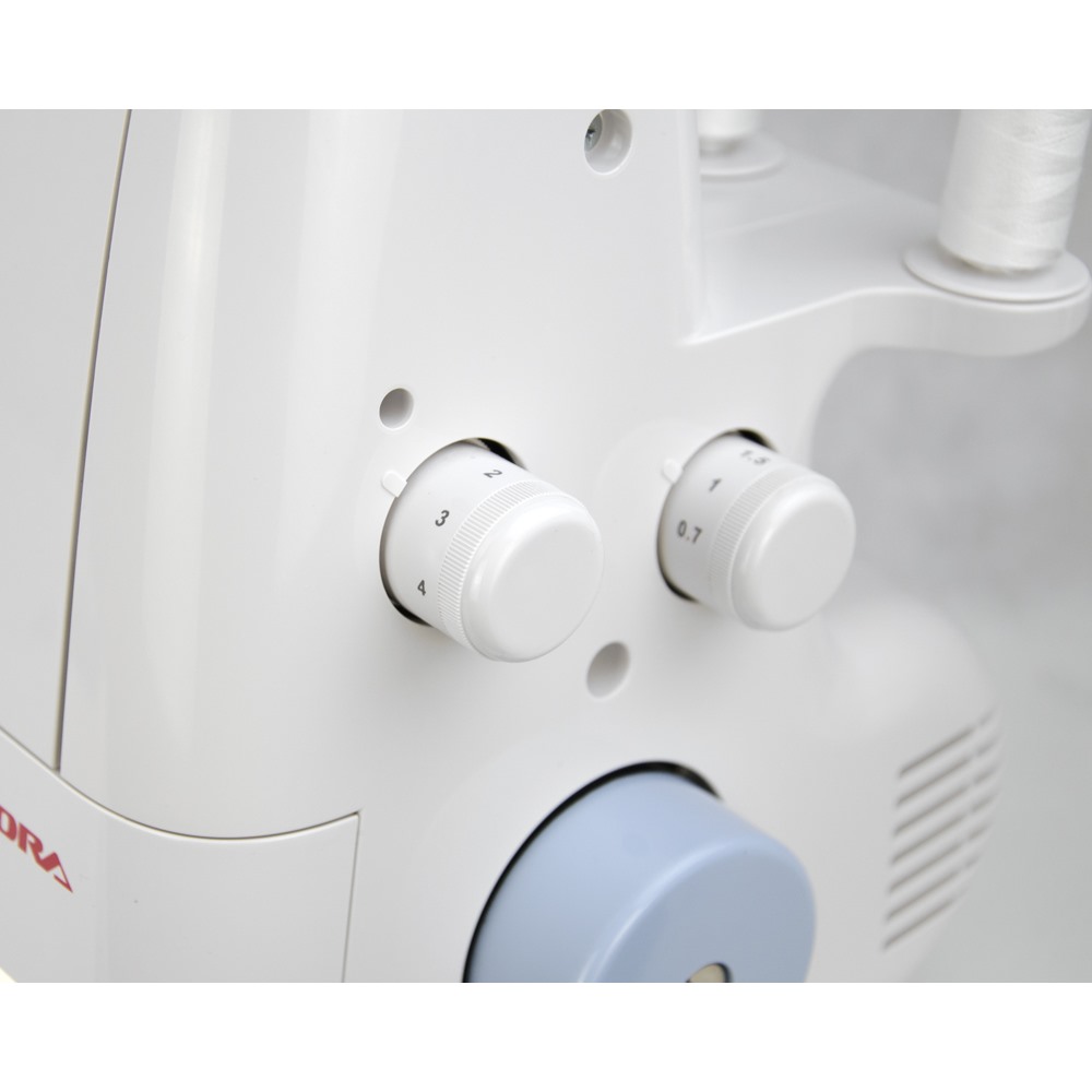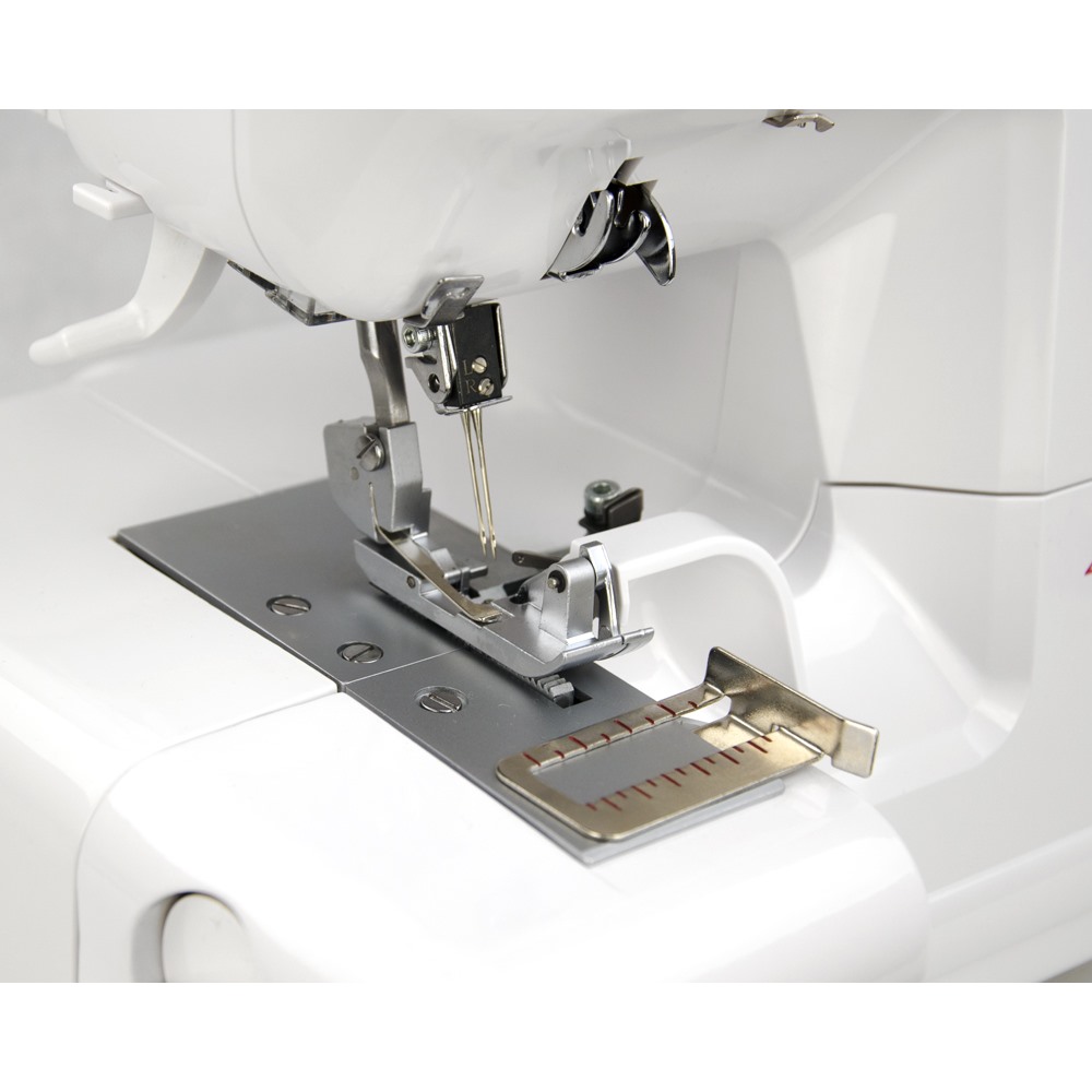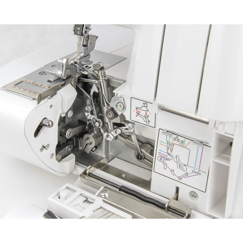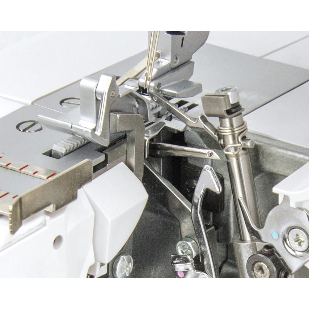 Оверлок оснащён функцией отключения ножа и регулировкой ширины обрезки ткани, что позволяет точно контролировать процесс. Лишние обрезки нитей собираются в мусоросборник, поддерживая рабочее место в чистоте. Для удобства работы предусмотрена светодиодная подсветка.