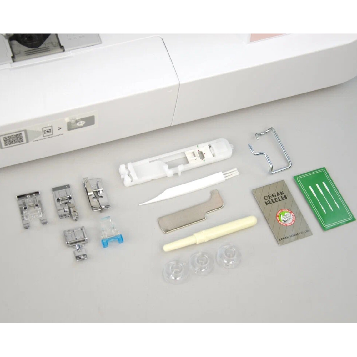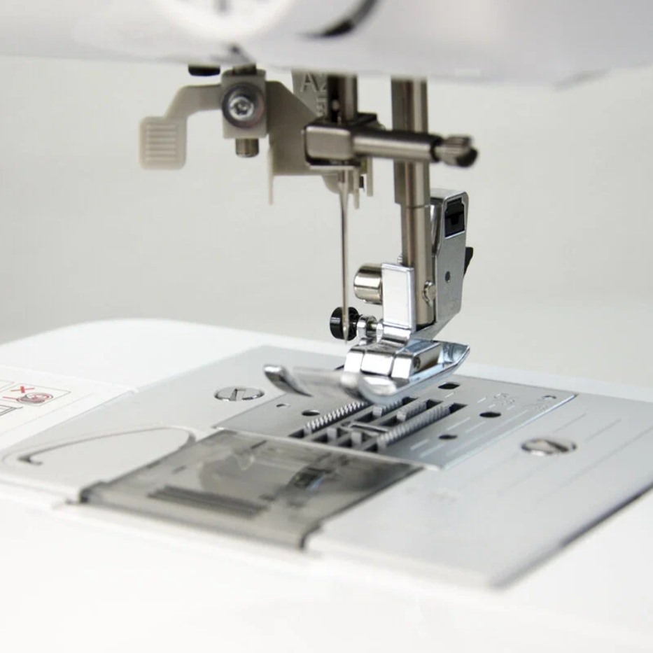 Дисплей упрощает выбор строчек и настройки, горизонтальный челнок обеспечивает плавную работу. Справляется с джинсой и многослойными тканями, защита пальцев гарантирует безопасность новичкам.